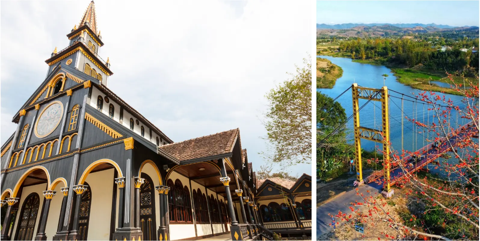 - The Kon Tum Wooden Church, built in 1913, is a remarkable architectural gem that blends Romanesque and traditional Bahnar stilt house styles. Made entirely of precious rosewood, the church features intricate carvings and stained-glass windows, creating a warm and sacred atmosphere.